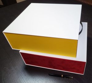 si sunt realizate din carton dur de 2 mm (mucava, carton de legatorie) caserate la interior si exterior cu hartie colorata in masa.