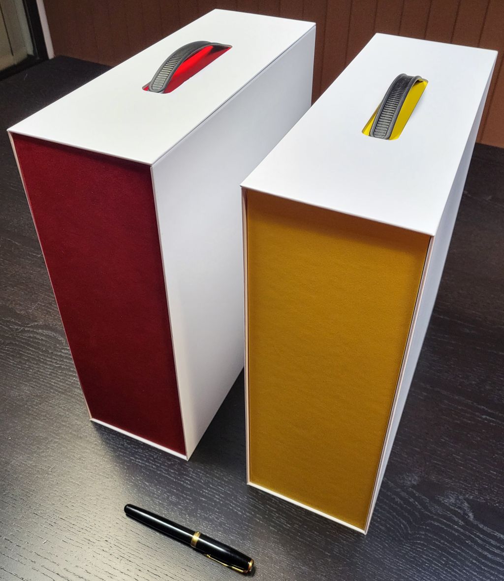si sunt realizate din carton dur de 2 mm (mucava, carton de legatorie) caserate la interior si exterior cu hartie colorata in masa.