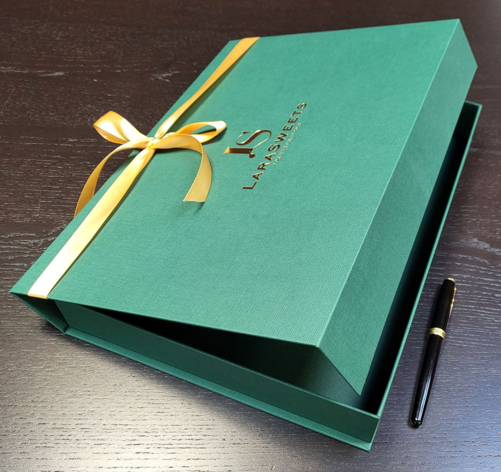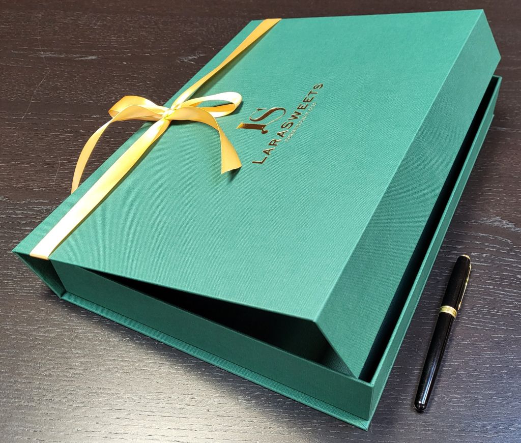 Cutia din imagine are dimensiunea de 344x244x45mm si are inchidere magnetica. Este realizata din carton dur de 2 mm (mucava, carton de legatorie) si caserata la interior si exterior cu hartie colorata in masa.