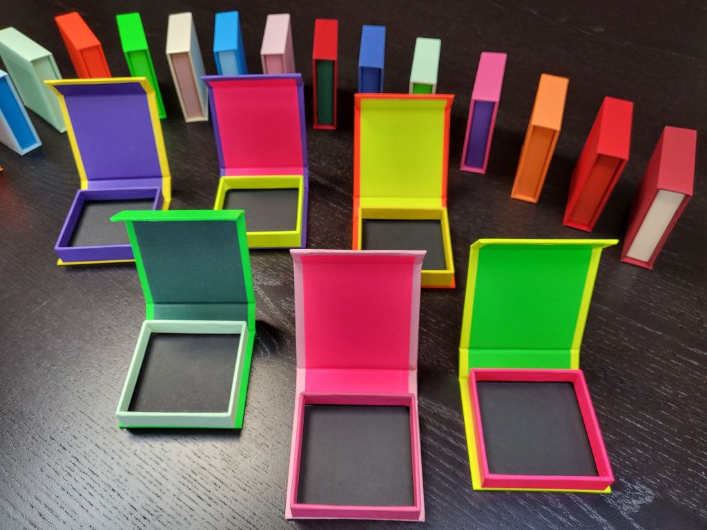 Se pot realiza cutii rigide din mucava cu diverse grosimi (1.8 mm, 2 mm, 2.5 mm, 3 mm etc.).